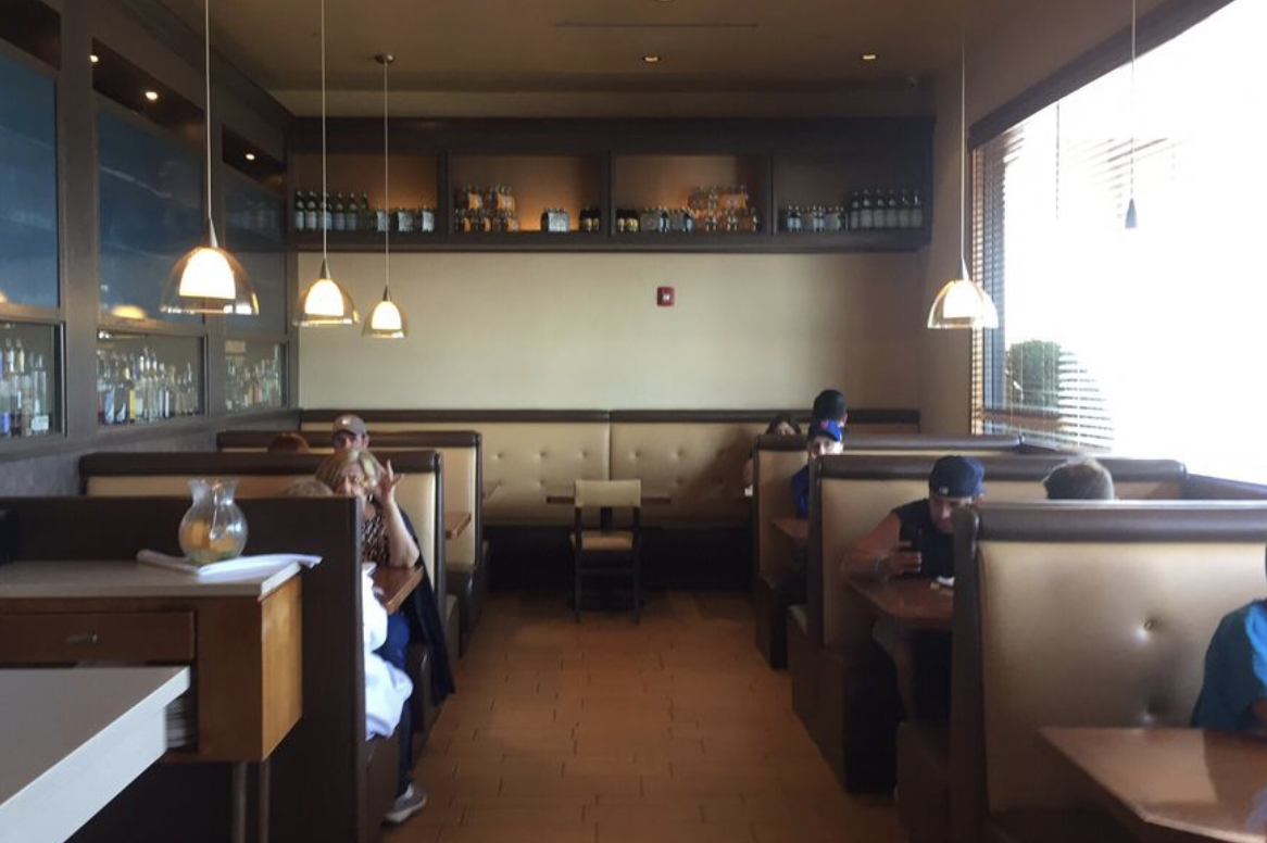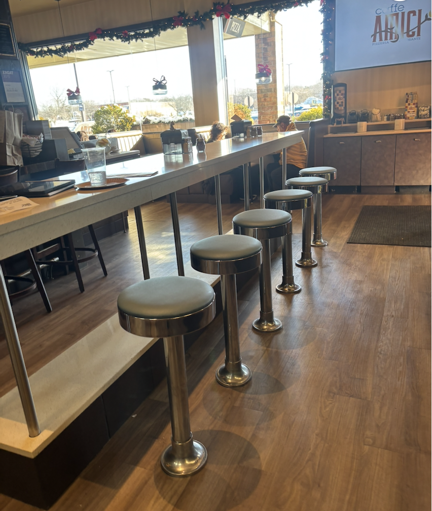 Places to sit:  booths, tables with armless chairs, full-height bar, counter at pizza area