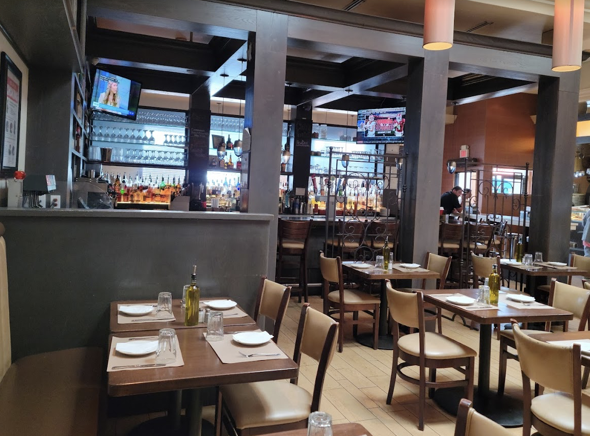 Seating is at booths, tables with armless chairs, a full-height bar, and counter in the pizza area.