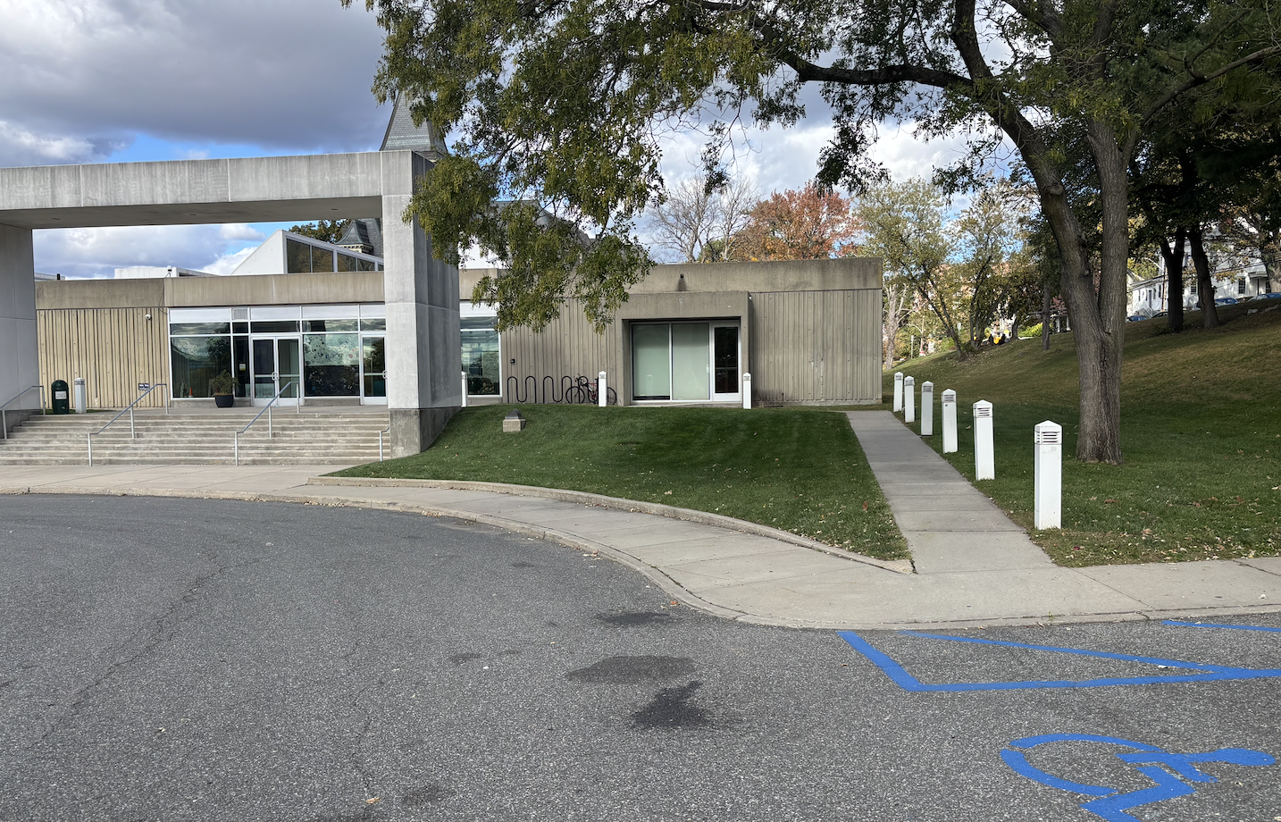 You can access the museum either by going up eight steps or using the walk to the right of the two, double-door entrances.