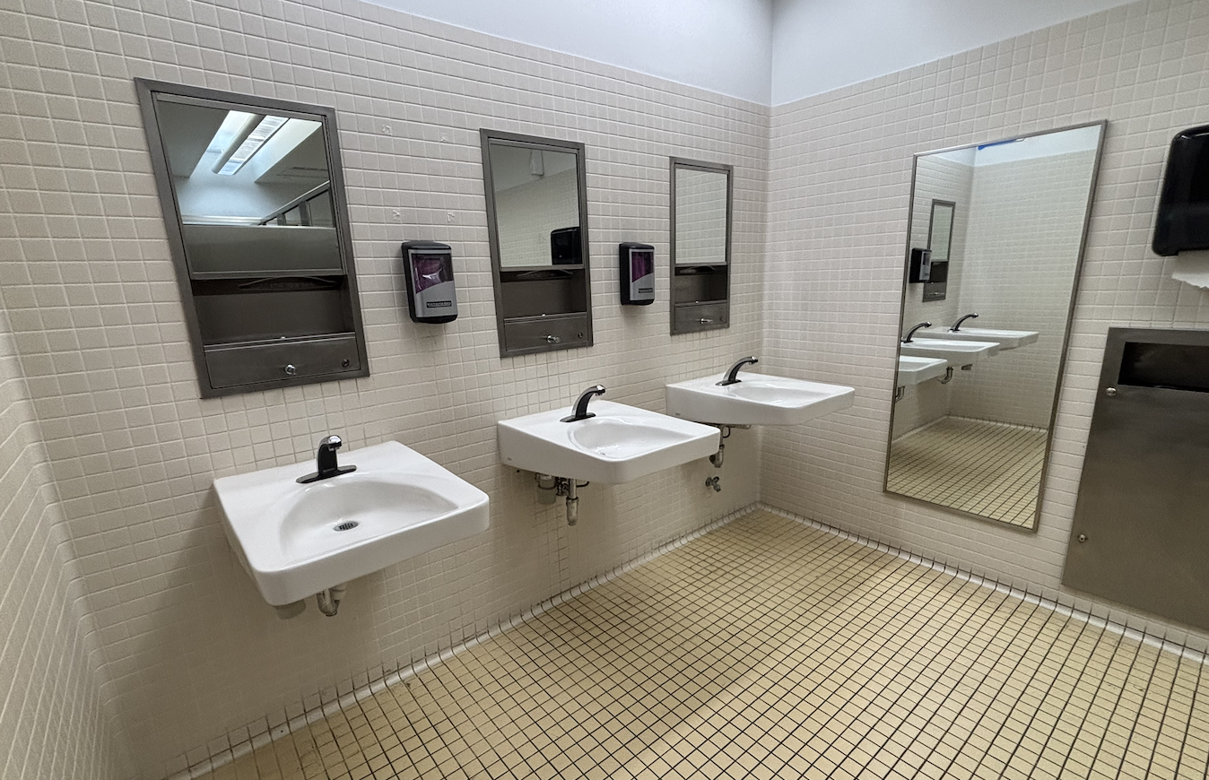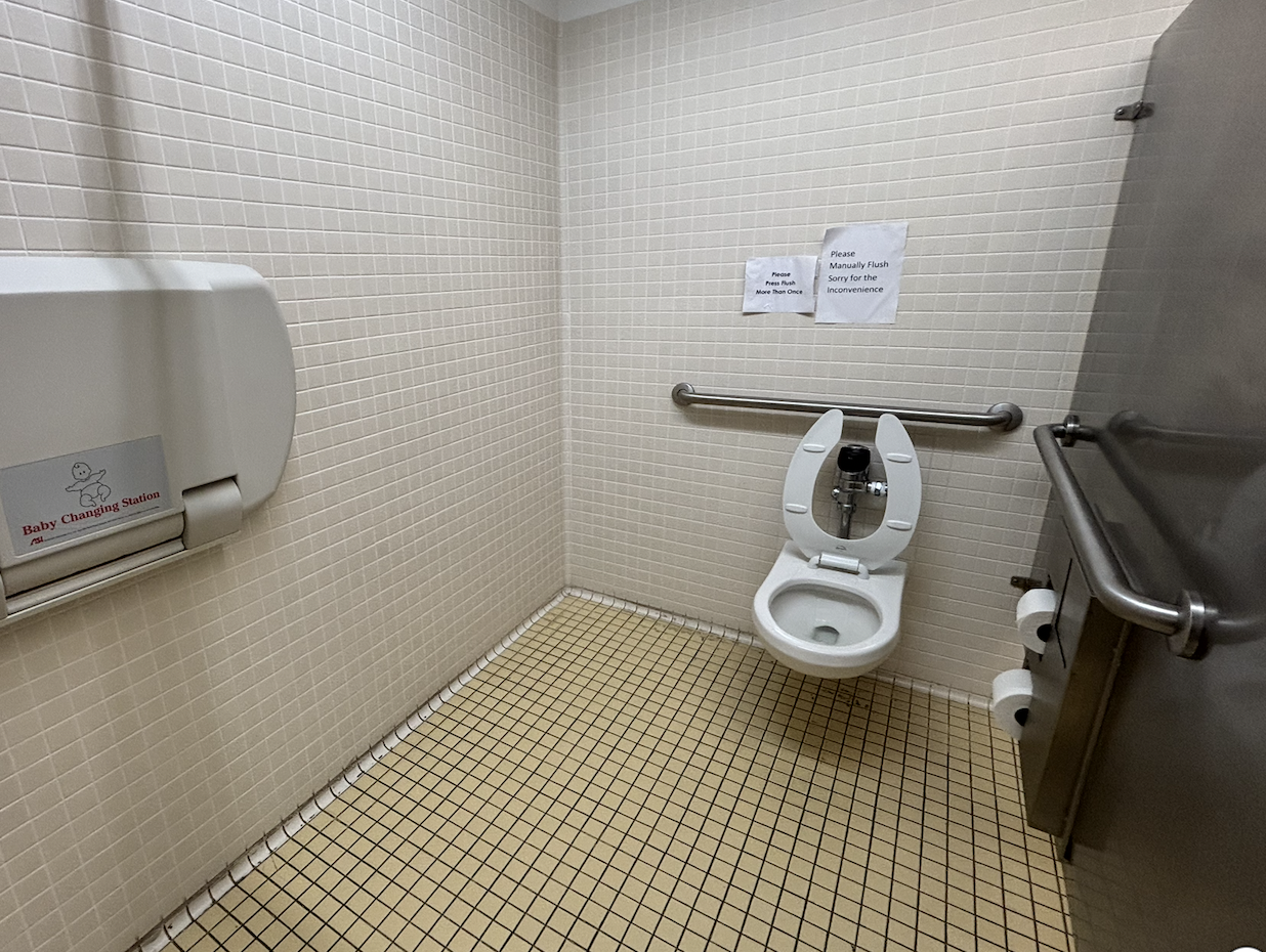 Multi-stall restrooms have an accessible stall and accessible sinks, as well as a baby-changing station.