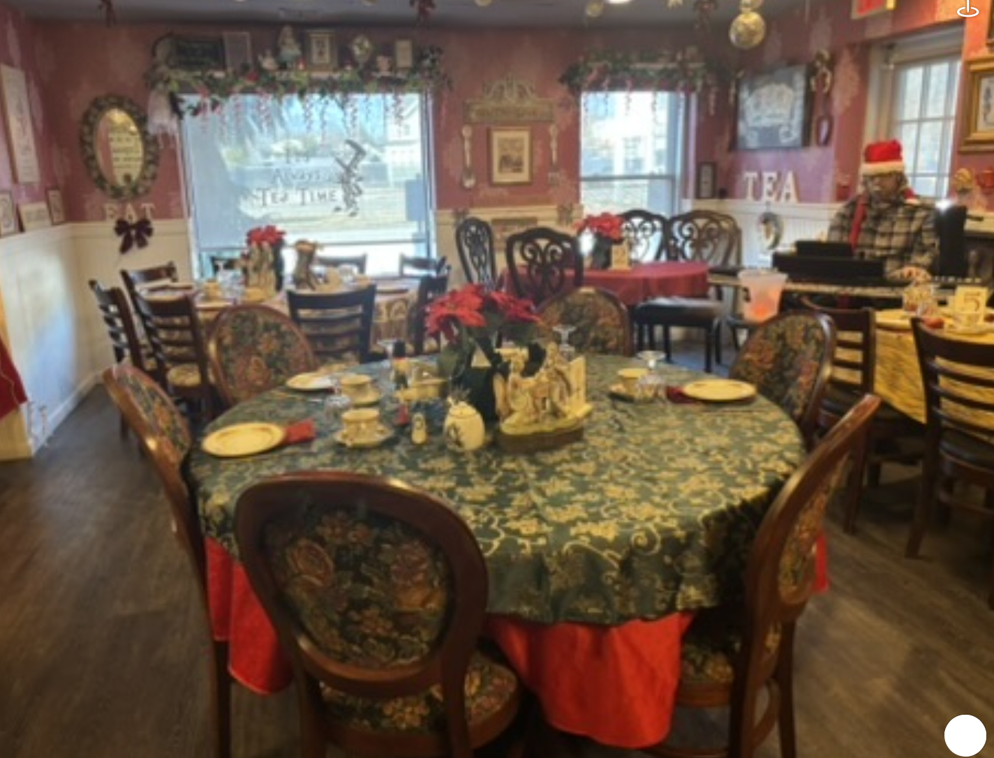 The tables are beautifully set as well. The vintage china settings were on holiday tablecloths, to go along with all of the holiday decorations that added yet more festivity to the tea room. There is adequate space to navigate throughout.
