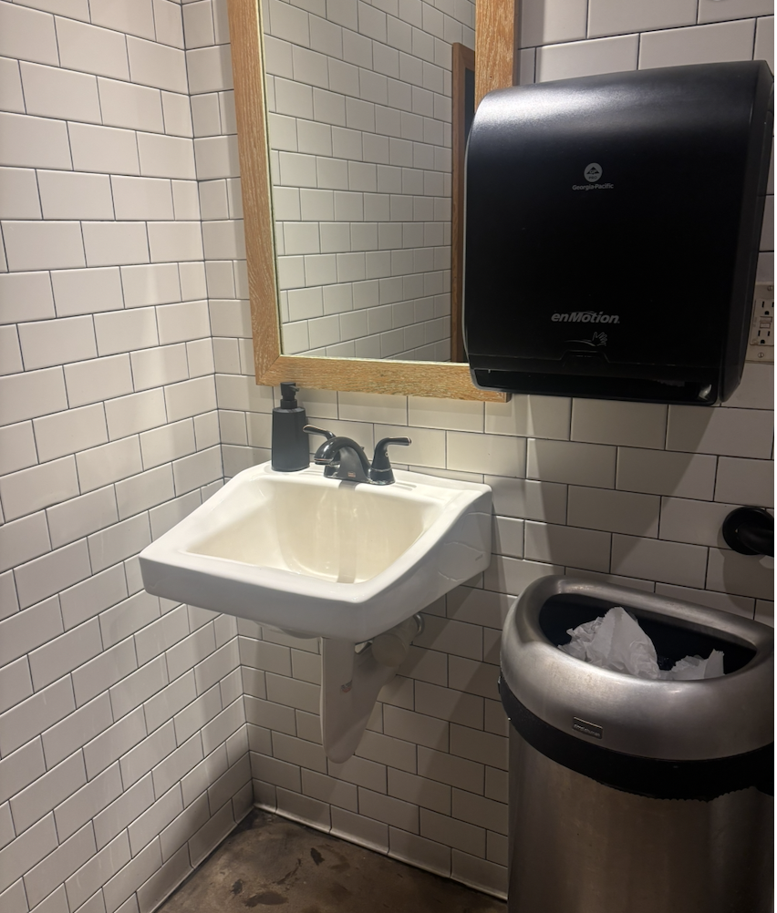 Large, single-occupancy, accessible restrooms are located in the hallway at the end of the bar.