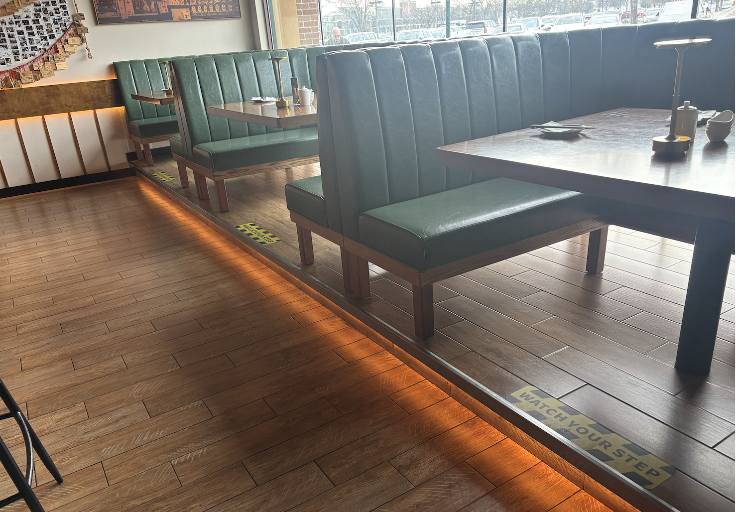 Places to sit:  booths ( some require a step up), tables and chairs (armless), banquettes, full-height bar