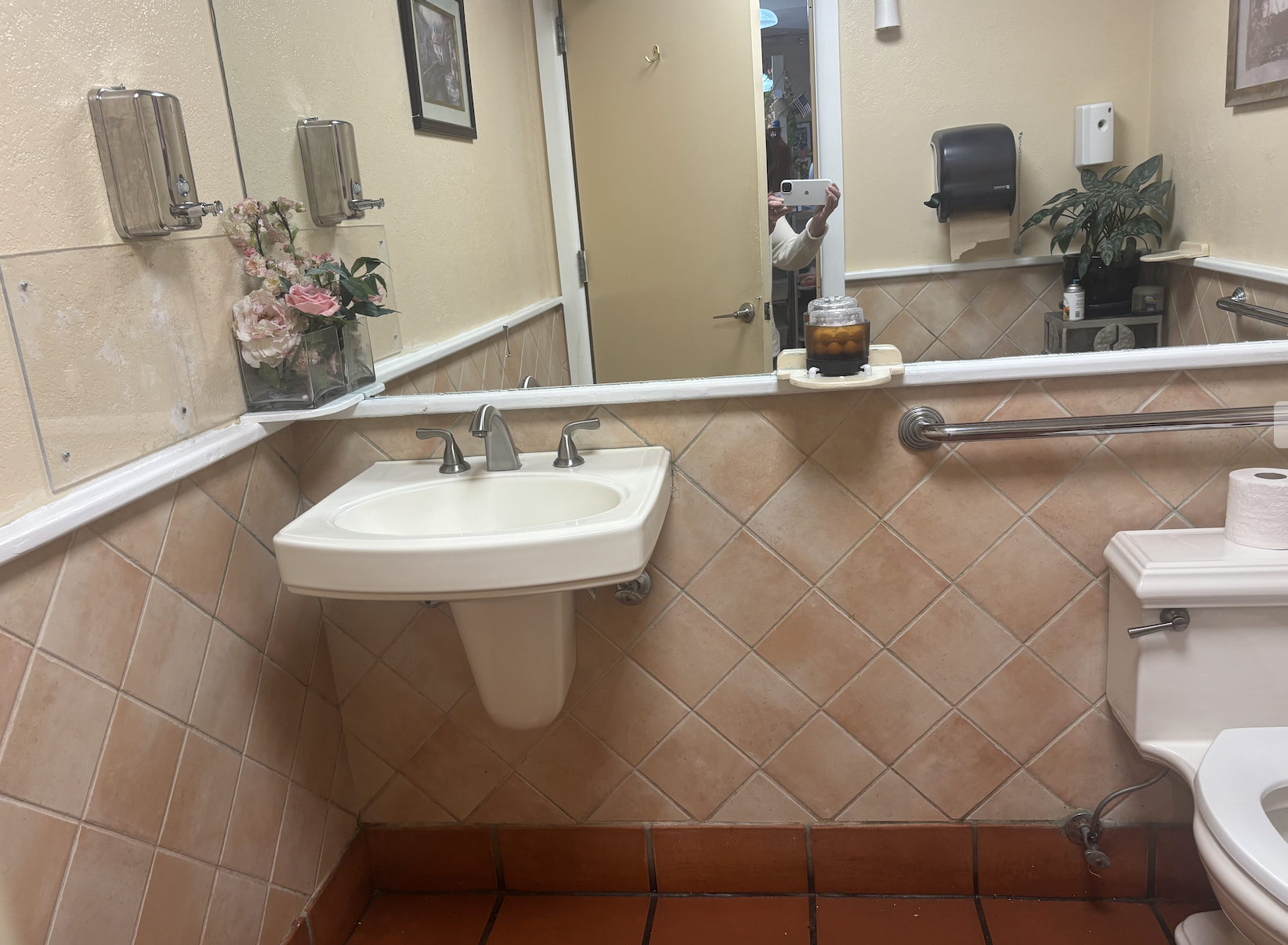 Multi-stall restrooms are located downstairs. The large, accessible, single-occupancy restroom is located on the main level, near the bar area. It was very thoughtful that the mirror above the sink was located low enough so that a wheelchair user can see it. This is not something that many establishments do.