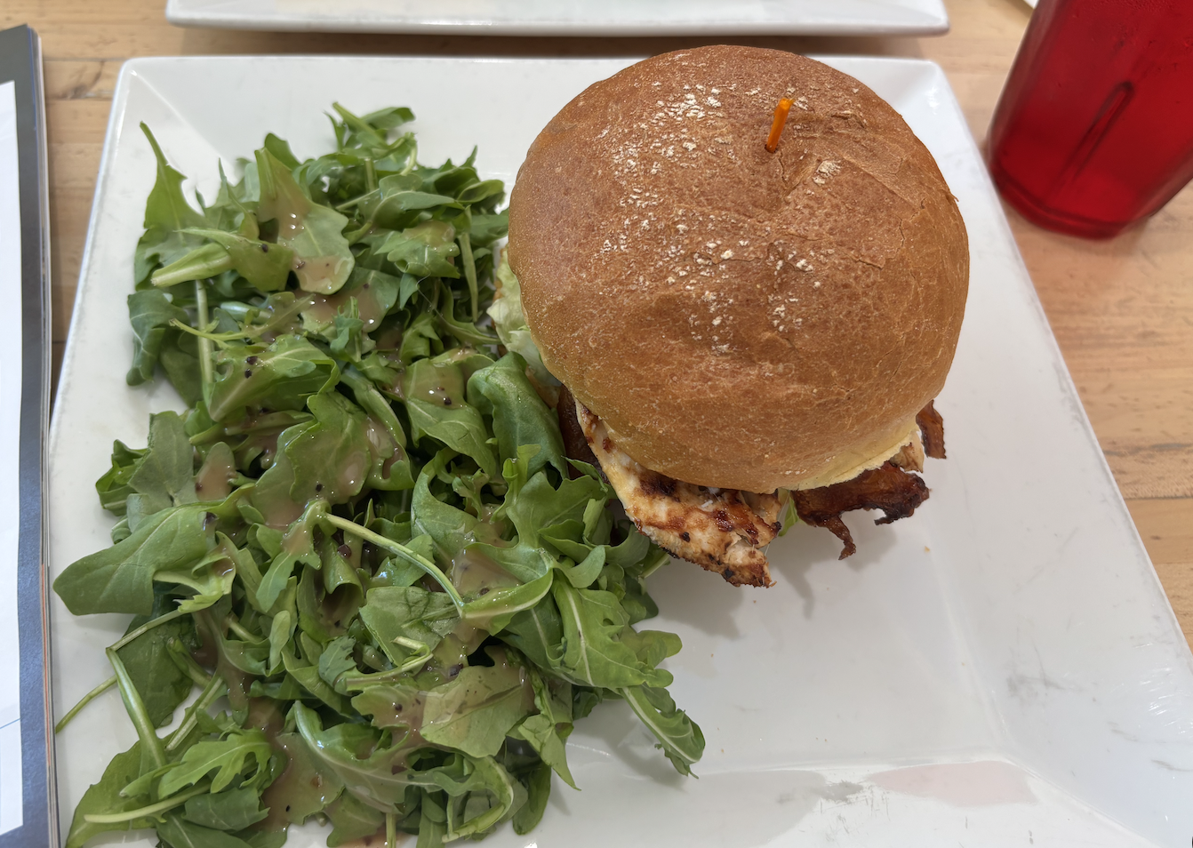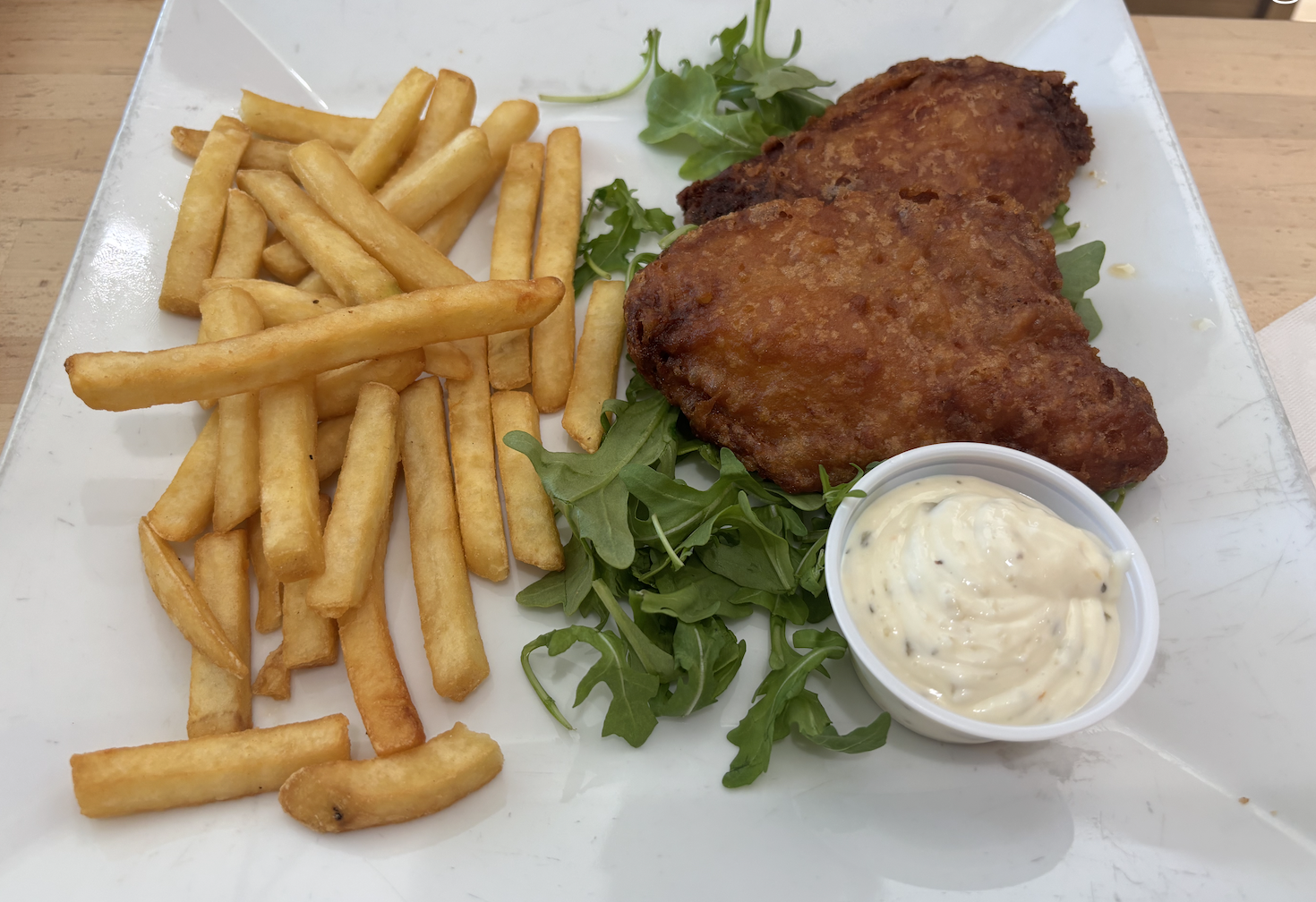 We made our way to a booth and proceeded to peruse the rather large menu.  There is a good variety of offerings. Our choices of Fish and Chips, and a Chicken Cobb Sandwich turned out to be perfect! We were able to enjoy our lunch in a pleasant, un-rushed manner.