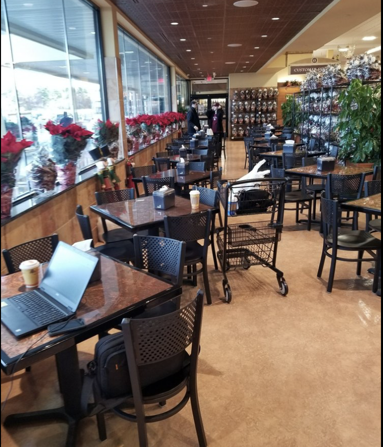 Today was the first time I have had dinner in their cafe. To tell the truth, I had never really noticed it. Now that I have, we will enjoy it more often. You can order whatever you want from any of the many counters in the store and take it to the lovely area behind the floral displays near the exit, to enjoy it. Tables and armless chairs are well spaced for easy navigation and there is even a microwave if you want to warm something up. It was an easy and enjoyable dinner for both of us.