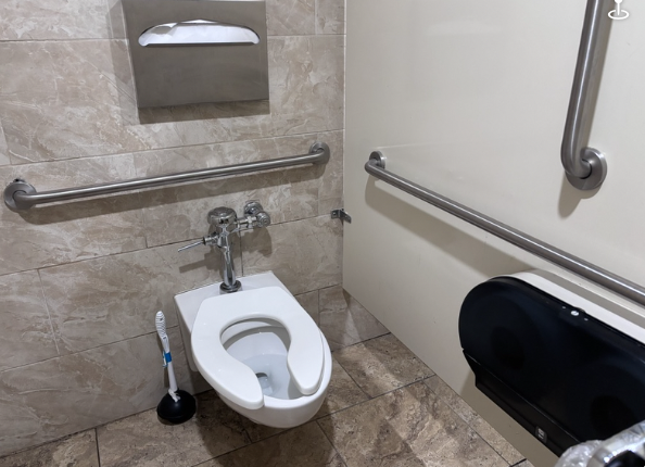 Multi-stall restrooms are located near the cafe. They have a large, accessible stall, plus everything is easy for a wheelchair user to reach.